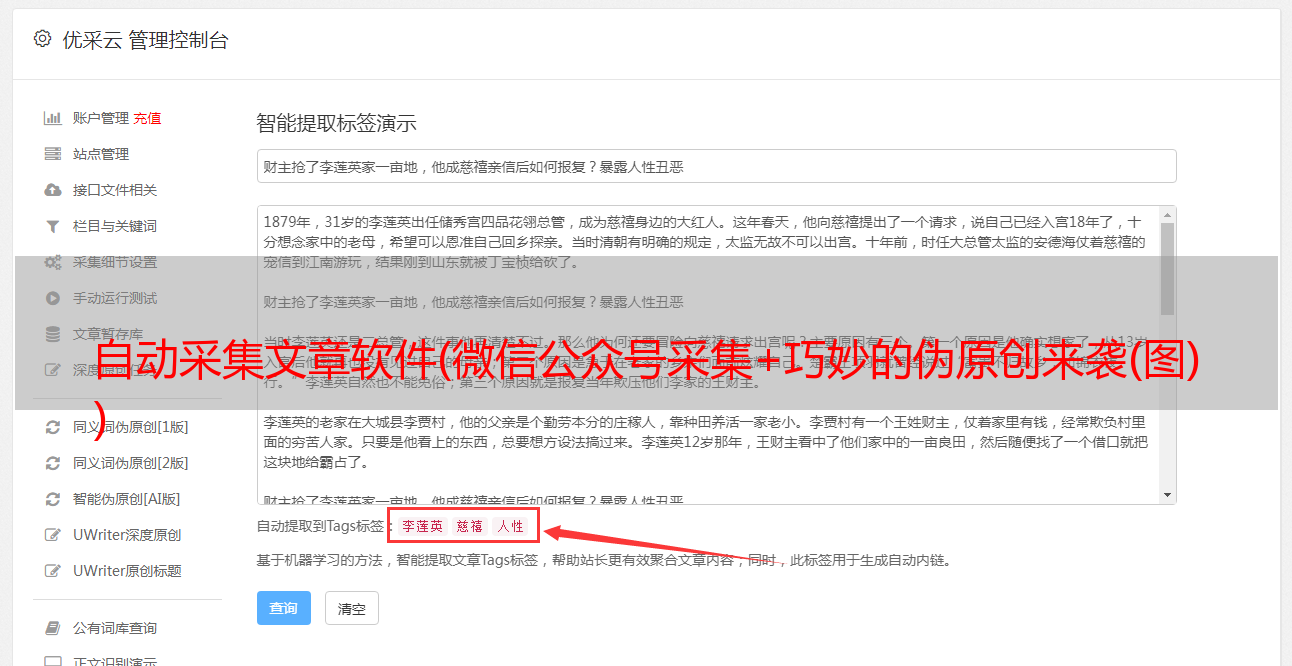 采集微信文章,然后伪原创点击这些文章,然后更新到网站。整个过程是全自动的。无需打开后台,通过数据库发送。因此,需要生成静态页面。