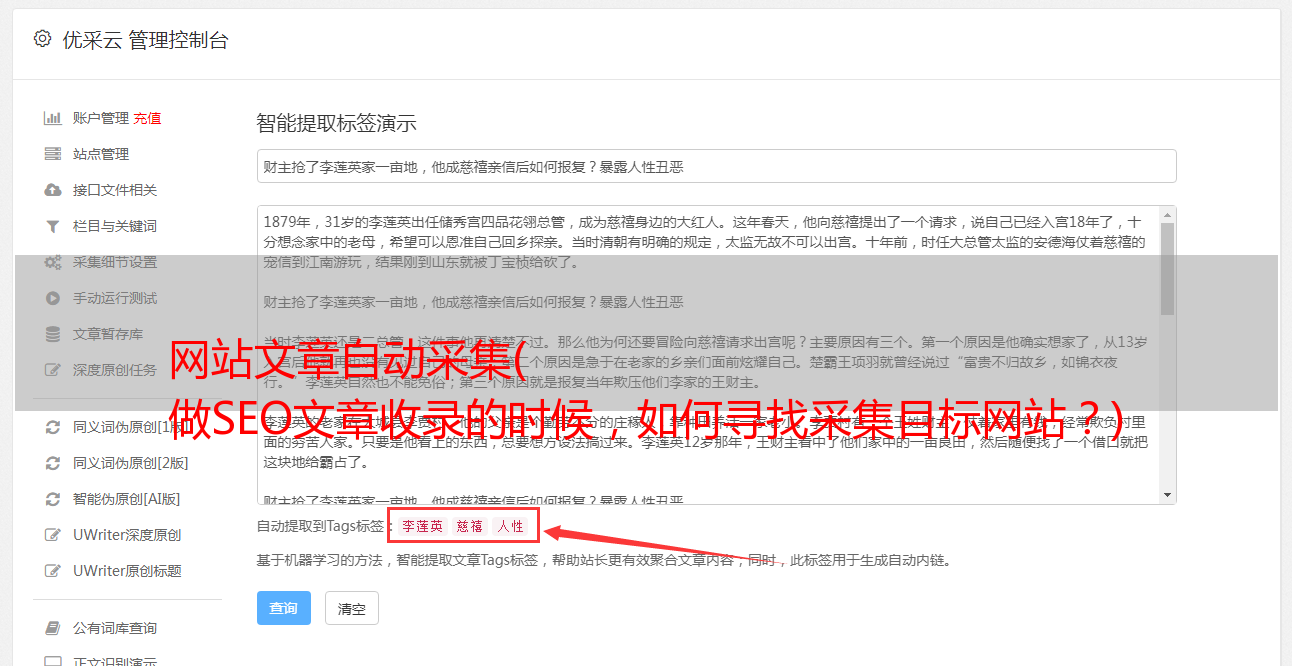 在采集的文字标题前加一些关键词@>,或者在文章加一些硬性的关键词@>。这有利于我们的收录和排名。量变引起质变。当你有一千个文章带有这些字段,当别人搜索的时候,你的一千个文章就有机会展示出来。同理,放到内容栏,也是一样的,效果也是一样的。