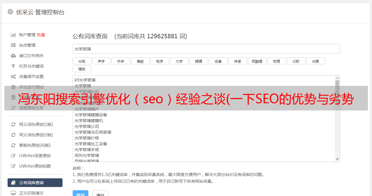 优采云 发布时间: 2021-11-20 02:19冯东阳搜索引擎优化(seo)经验之谈(一下SEO的优势与劣势,内容不同于你可以搜索到的文章)
