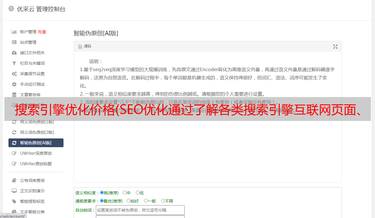 优采云 发布时间: 2021-11-21 09:14搜索引擎优化价格(SEO优化通过了解各类搜索引擎互联网页面、进行相关的优化)