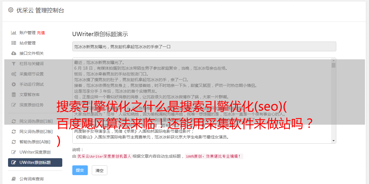 它一定是 原创 好,因为搜索引擎是这么说的。很多站长会问,为什么我原创很多文章,不然收录?收录 没有排名?一个搜索引擎,其核心价值是为用户提供最需要的结果。搜索引擎对网民的需求有统计。对于网民需求量很小或几乎没有需求的内容,即使你是原创,也可能会被搜索引擎忽略。对于网民需求量很大的内容,收录应该更多更快。不过因为收录多了,就算你是原创,也可能很难挤进排名。既然原创好,为什么要采集?原创虽然不错,但只要方法得当,采集的效果不会比原创差多少,甚至比那些没有掌握方法的人要好得多。精力有限,原创难以保证长期大量更新。如果你问编辑,投入产出比可能是负数。