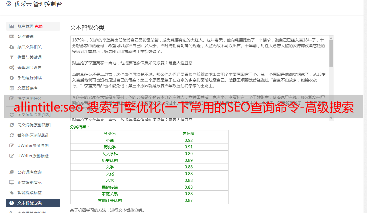 优采云 发布时间: 2021-11-23 08:22allintitle:seo 搜索引擎优化(一下常用的SEO查询命令-高级搜索命令)