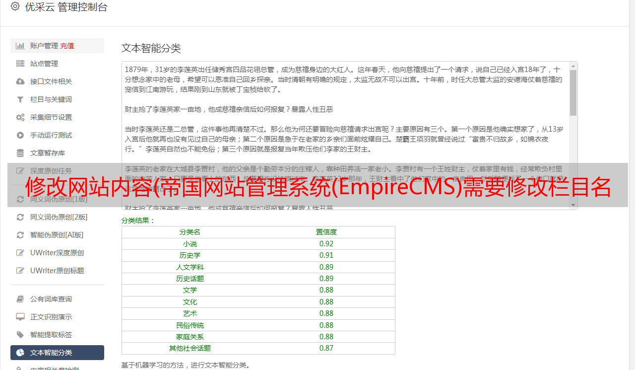 优采云 发布时间: 2021-11-23 19:08修改网站内容(帝国网站管理系统(EmpireCMS)需要修改栏目名称的随笔)