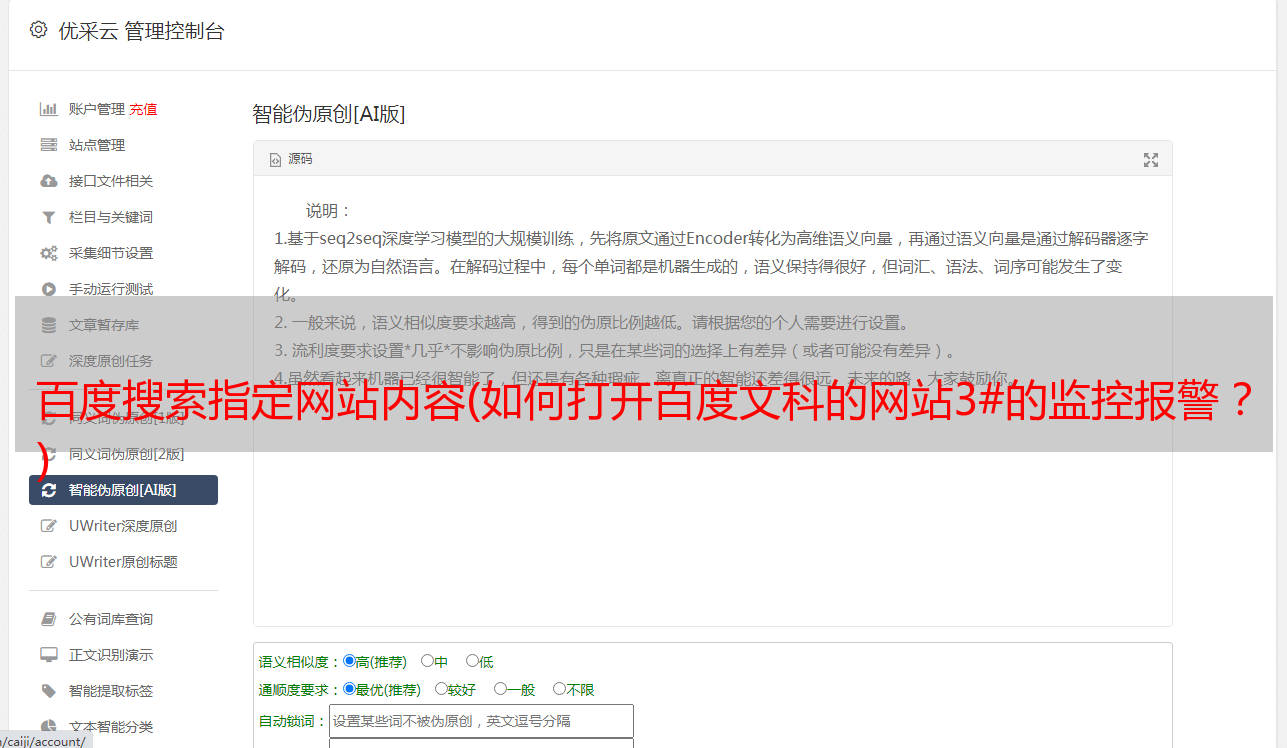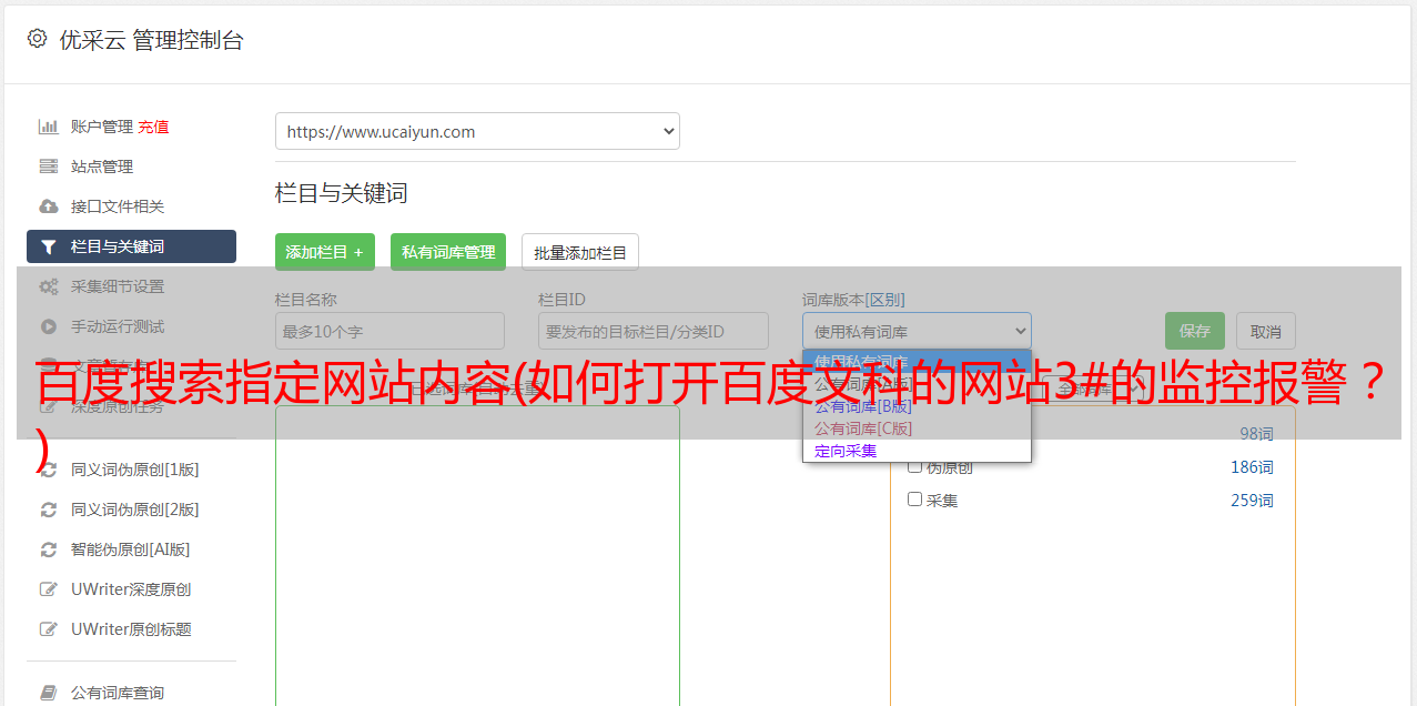 优采云 发布时间: 2021-11-26 07:00百度搜索指定网站内容(如何打开百度文科的网站3#的监控报警?