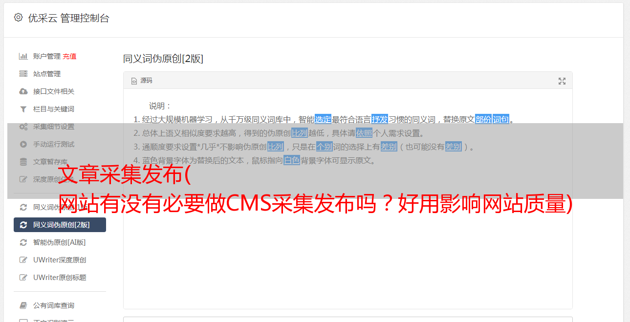伪原创工具:与优采云、优采云等采集软件无缝对接,支持本地批量伪原创+支持网站API接口