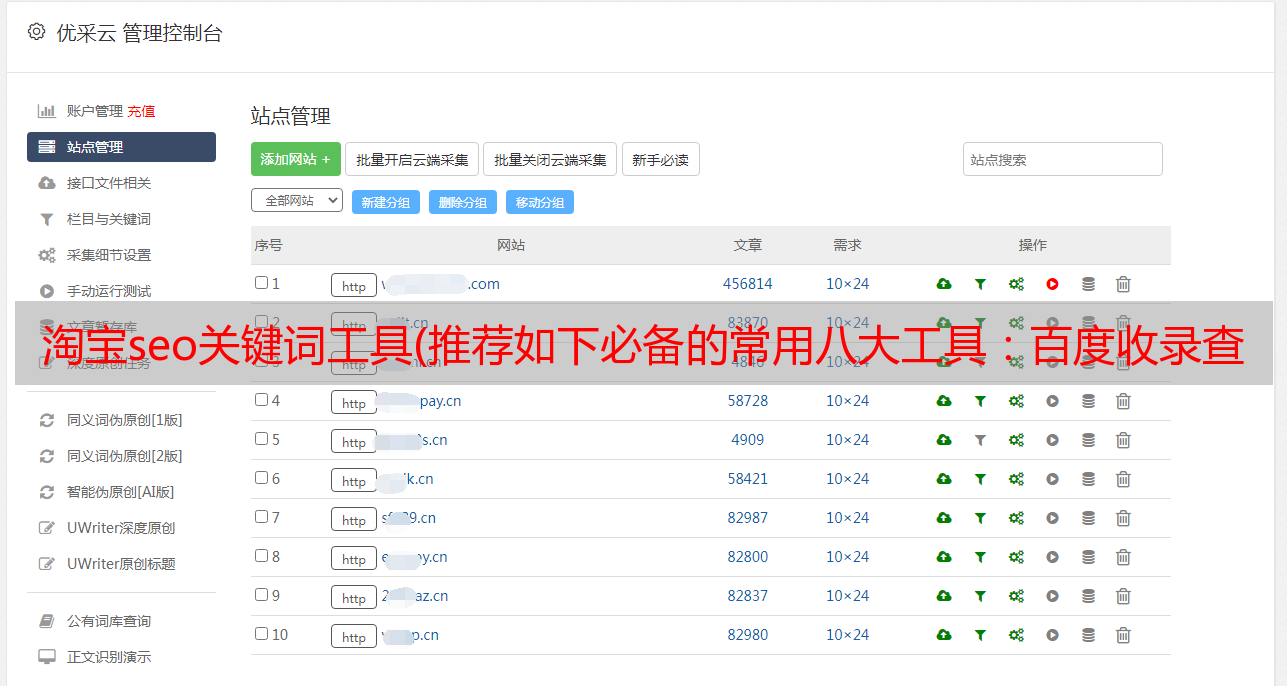 优采云 发布时间: 2021-11-29 23:28淘宝seo关键词工具(推荐如下必备的常用八大工具:百度收录查询批量工具)