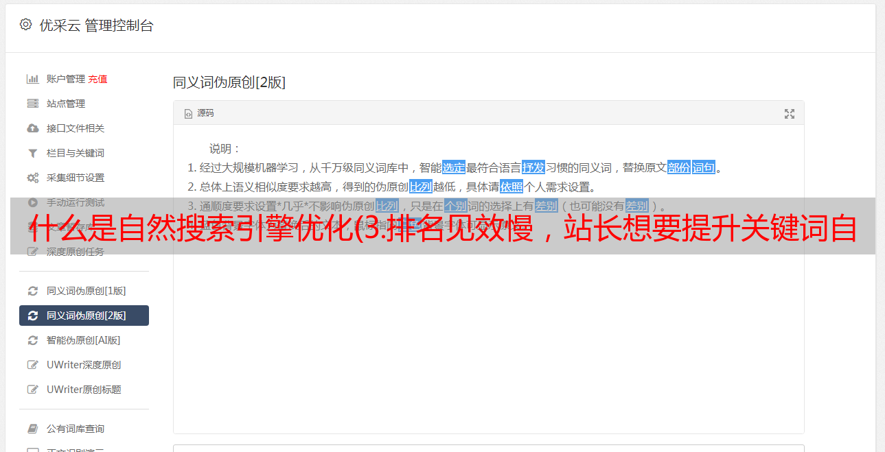 优采云 发布时间: 2021-11-30 00:07什么是自然搜索引擎优化(3.排名见效慢,站长想要提升关键词自然排名,需掌握)