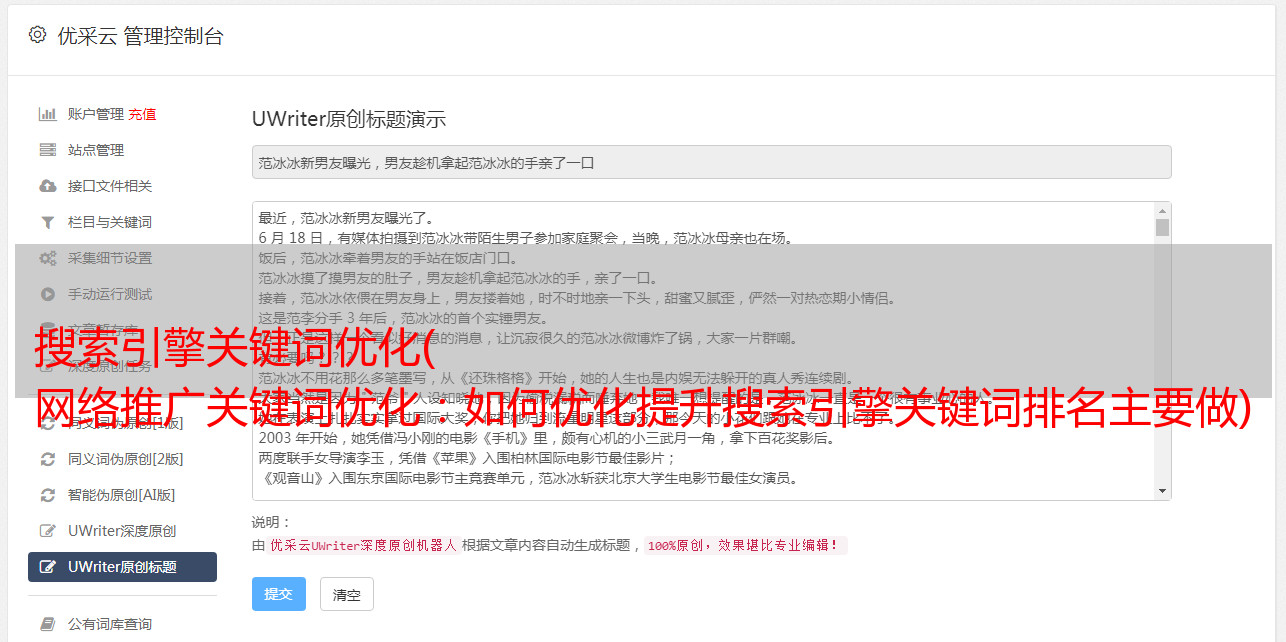 搜索引擎优化和推广需要做好内容,内容才能吸引用户点击查看。所以需要定期更新原创优质内容,增加自己的观点,给用户带来不一样的感受。这不仅可以增加用户对网站的访问量,还可以提高网站的优化排名,同时增加用户好感度。.