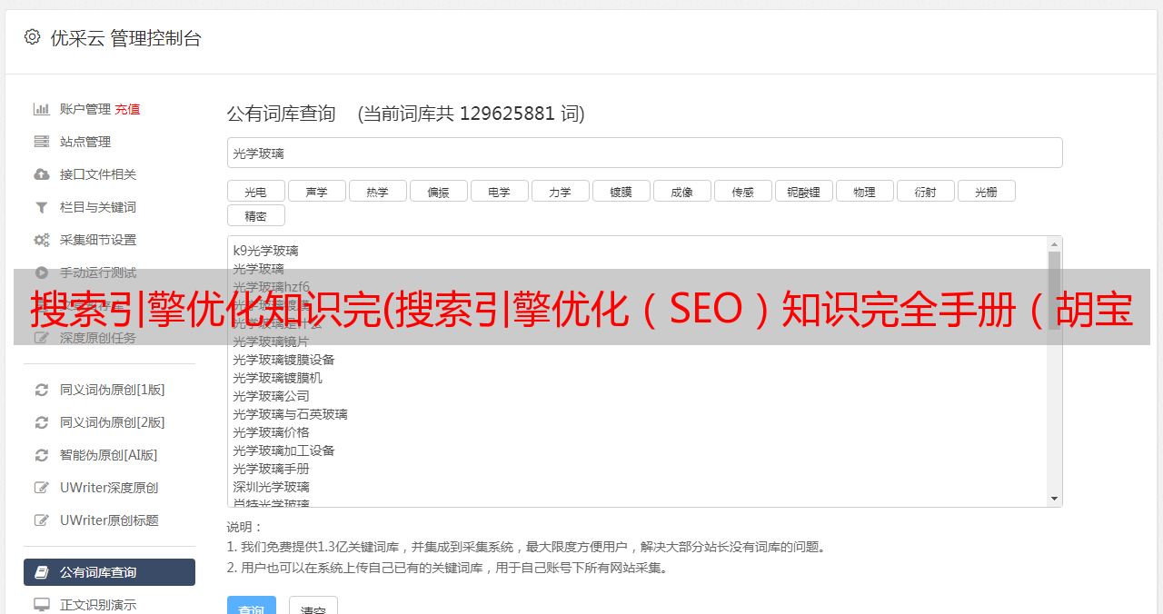 优采云 发布时间: 2021-12-01 18:20搜索引擎优化知识完(搜索引擎优化(SEO)知识完全手册(胡宝介))