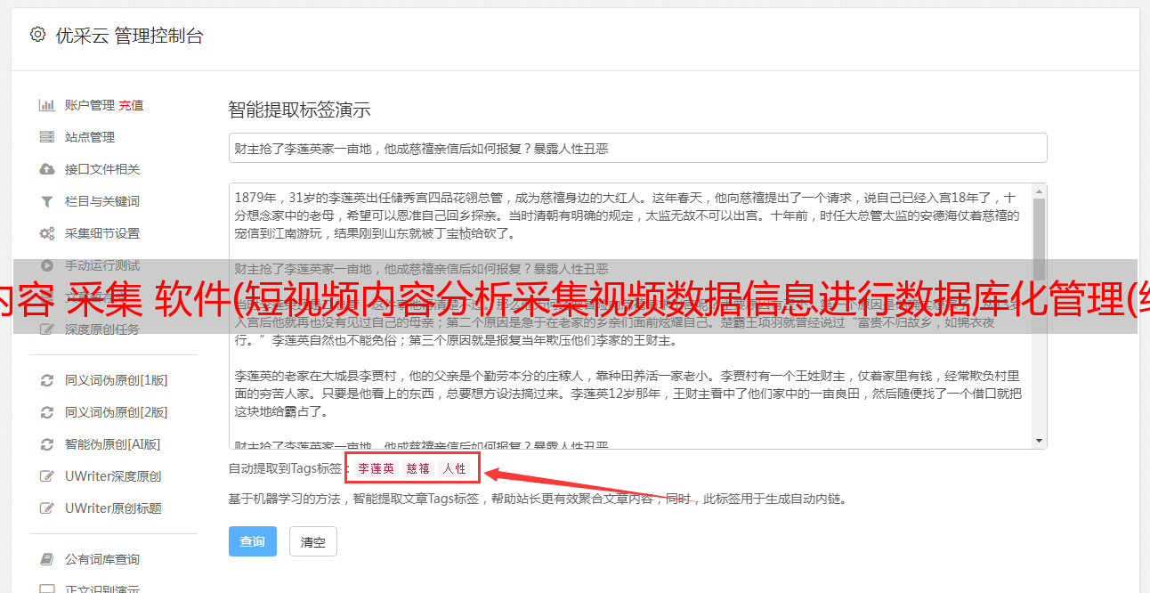 短视频内容分析采集管理软件是一款视频内容分析软件,可以对采集视频和采集的视频数据信息进行数据管理,对采集进行分析和分析。视频内容的内容管理。