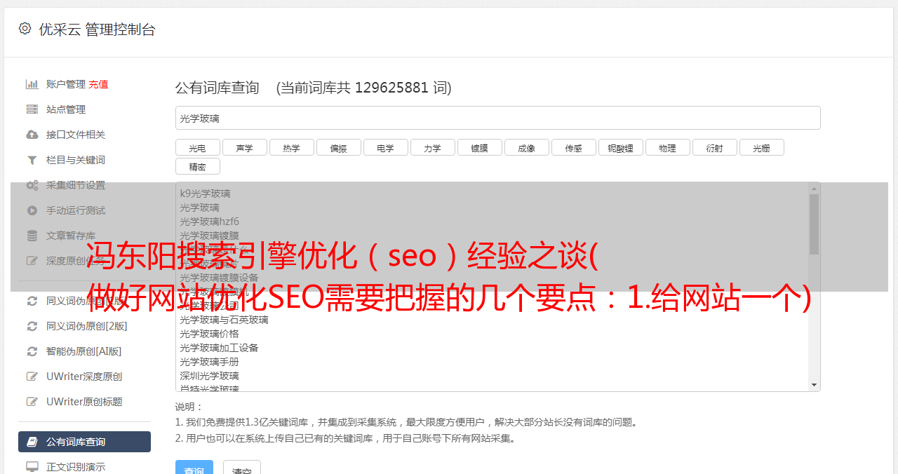 优采云 发布时间: 2021-12-04 17:24冯东阳搜索引擎优化(seo)经验之谈(
