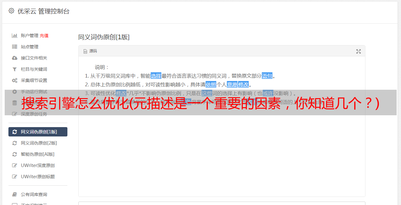 优采云 发布时间: 2021-12-06 16:08搜索引擎怎么优化(元描述是一个重要的因素,你知道几个?)
