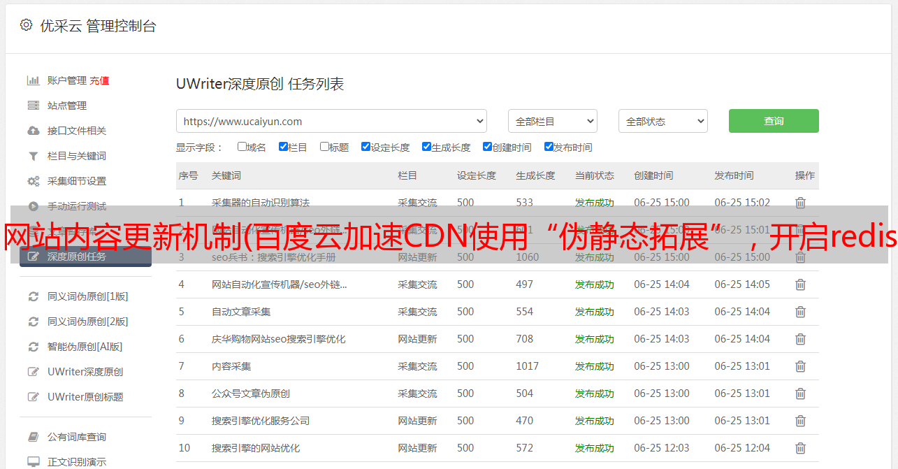 优采云 发布时间: 2021-12-06 23:12网站内容更新机制(百度云加速CDN使用“伪静态拓展”,开启redis和memcached缓存)
