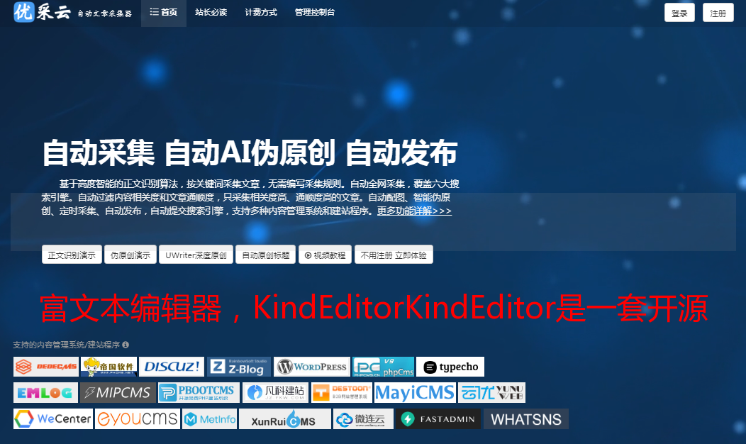 KindEditor是一个开放源代码的在线HTML编辑器,主要用于允许用户在网站上获得所见即所得的编辑效果。开发人员可以使用KindEditor用Visual Rich Text输入框替换传统的多行文本输入框(textarea)。 KindEditor用JavaScript编写,可以与Java,.NET,PHP,ASP和其他程序无缝集成。它更适合用于cms,购物中心,论坛,博客,Wiki和电子邮件等Internet应用程序。