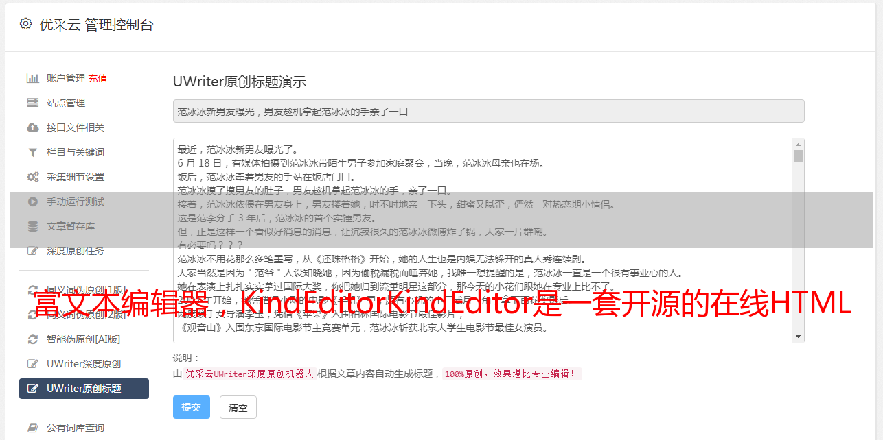 UEditor是WYSIWYG富文本Web编辑器,由百度的Web前端研发部门开发。它是轻量级的,可定制的,并且专注于用户体验。它是基于MIT协议的开源软件,可以免费使用和修改代码。