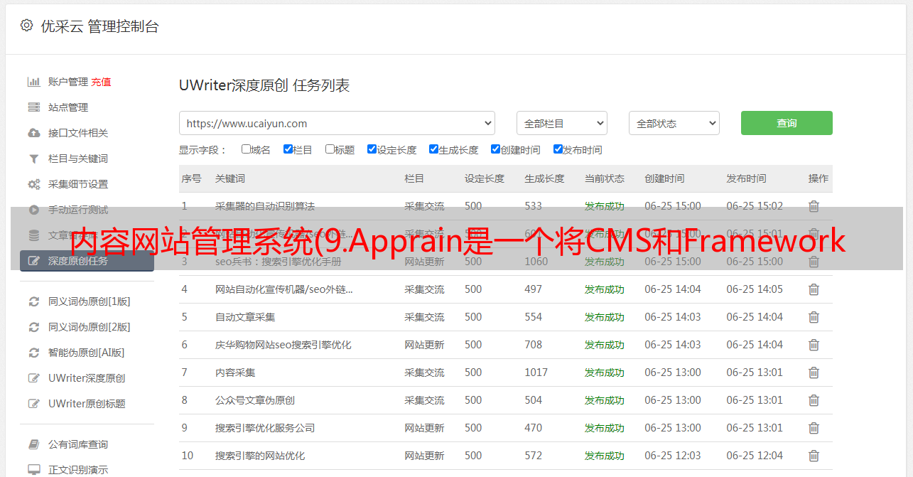 优采云 发布时间: 2021-12-09 09:06内容网站管理系统(9.Apprain是一个将CMS和Framework两个概念完美结合的内容管理系统)