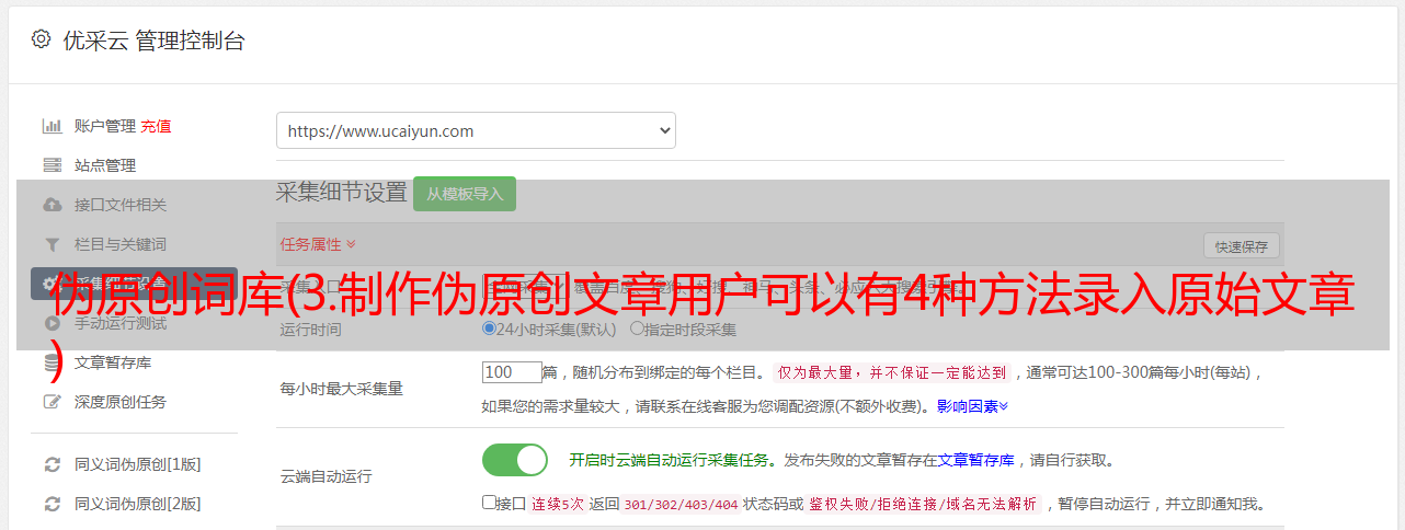 为什么要设置这个功能?一般现在主流网站是:个人和企业都占90%cms。cms中都自带采集功能,*敏*感*词*也可以使用“优采云”等第三方工具采集。随着采集返回的数据量越来越大,如何伪原创成为一个令人担忧的问题。