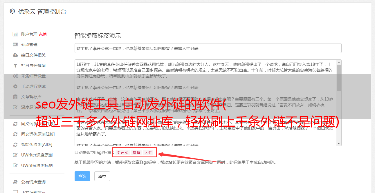 第一季教程中,蜘蛛精说快照被劫持后,快照将不再更新。可以通过蜘蛛精的自动外部链接进行更新。这个工具是一样的。外链可自动下发,可通过留痕方式批量生产大量外链。拥有3000多个外链网址库,轻松刷上千条外链不是问题。