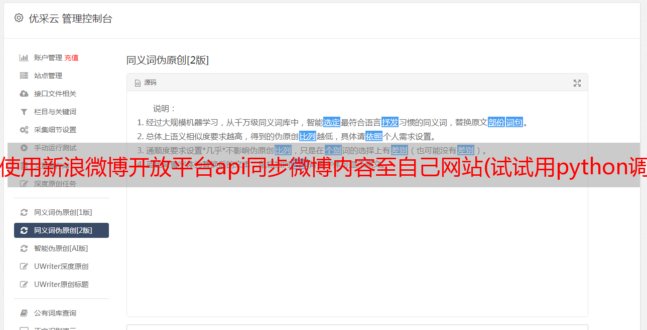 优采云 发布时间: 2021-12-10 10:13使用新浪微博开放平台api同步微博内容至自己网站(试试用python调用微博API的SDK授权所必须的
