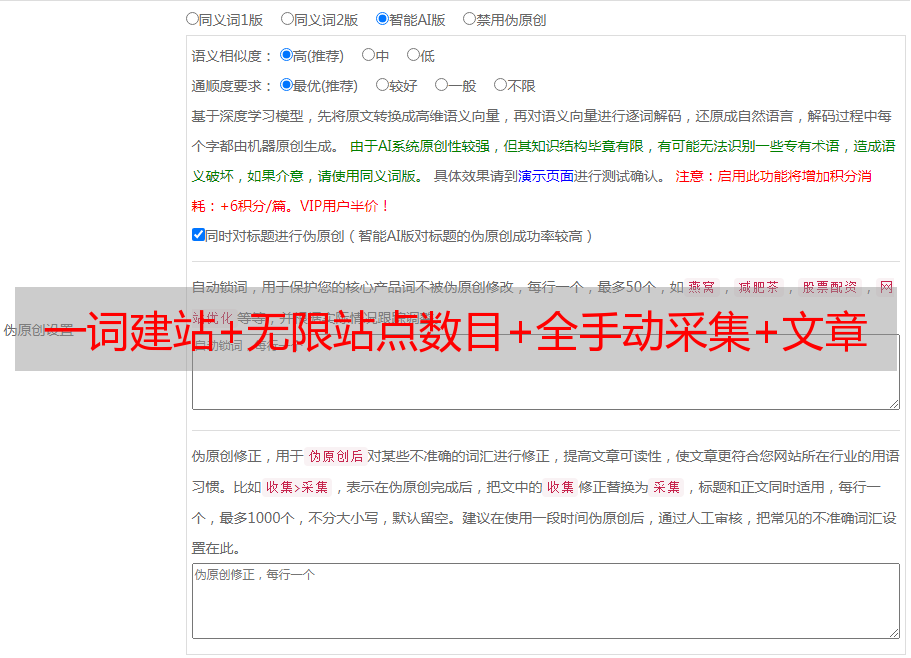 原文可读性前提下手动进行伪原创,本系统具有独有的同义词和近义词引擎,可以适当改变文章语义,利用特有的算法进行控制,让整篇文章都接近原创文章,而这一切全部是系统智能手动的完成的,无需人干预。