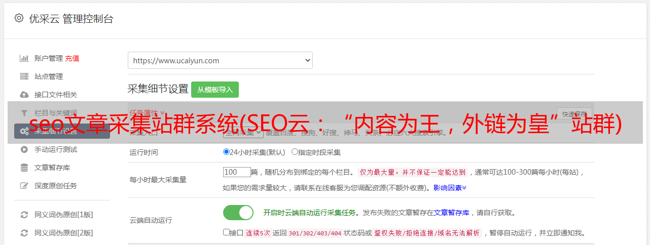 优采云 发布时间: 2021-12-12 21:23seo文章采集站群系统(SEO云:“内容为王,外链为皇”站群)