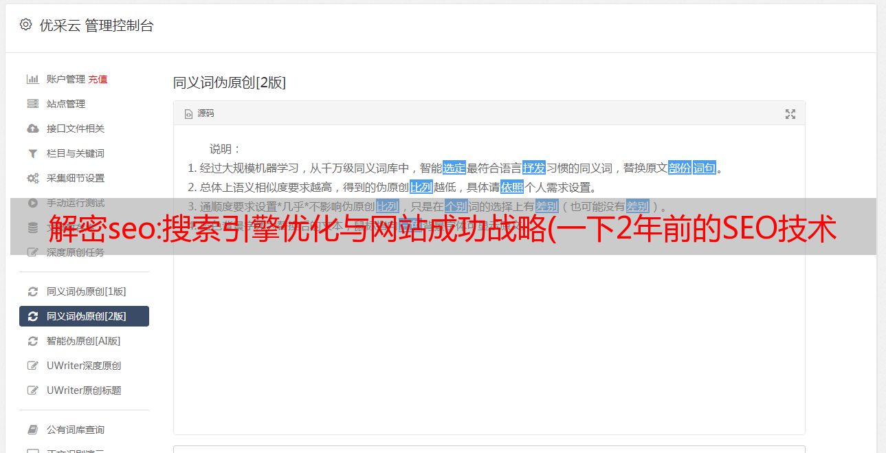 优采云 发布时间: 2021-12-13 19:22解密seo:搜索引擎优化与网站成功战略(一下2年前的SEO技术讲现在的排名靠前是比较简单)
