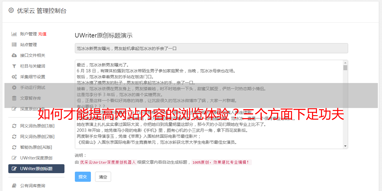 语言逻辑体现在两个方面。一种是内容本身在逻辑上是不合理的,例如词语使用不当或句子使用不当。另一个是网站的内容填充了大量的错字,导致网站的内容不令人满意。因此,在完成内容创建之后,我们还可能会仔细检查它,以最大程度地减少低级错误,例如错误的句子和错别字。还有一件事情需要特别注意。不要为了内容而创建内容。人为堆积,替换单词或颠倒伪原创的顺序是一种致命行为,会损害网站用户的体验。 网站内容构建的大忌。更新网站的内容时,建议尽可能避免使用稀有词和非常规语言。尽管不常用或不常规的语言词汇有时可以提高网站的内容,但它增加了用户阅读理解的难度和风险,也不利于搜索引擎识别收录。