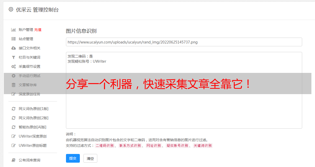 优采云采集是一款自媒体素材搜索、文章原创、一键发布的营运工具,有效提高新媒体营运工作效率,降低企业成本。