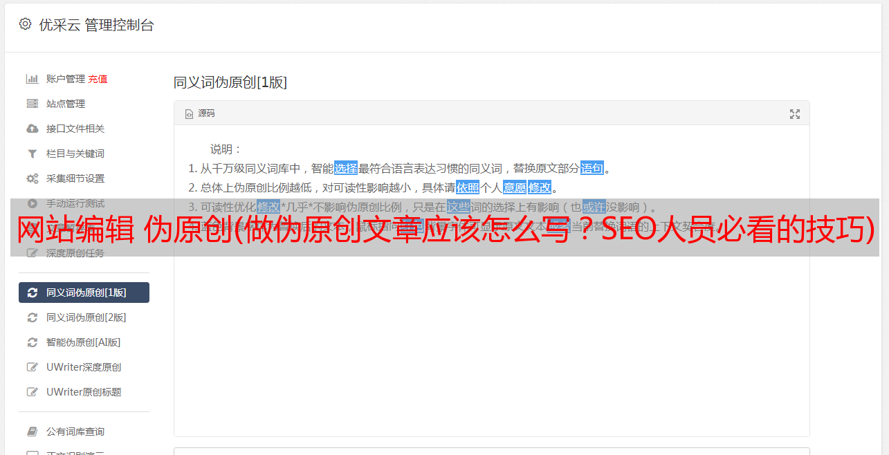 优采云 发布时间: 2021-12-16 07:25网站编辑 伪原创(做伪原创文章应该怎么写?SEO人员必看的技巧)