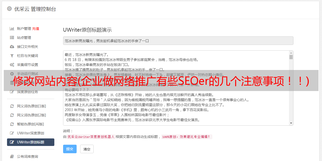 优采云 发布时间: 2021-12-18 21:01修改网站内容(企业做网络推广有些SEOer的几个注意事项!!)
