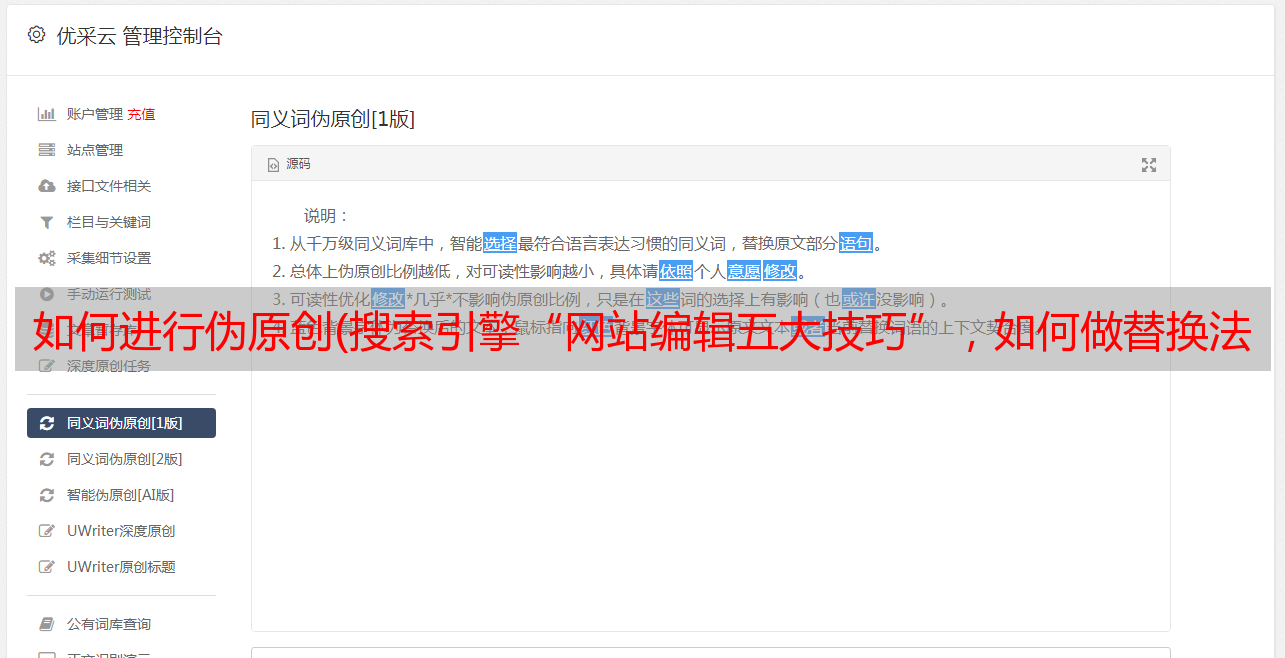 优采云 发布时间: 2021-12-19 06:10如何进行伪原创(搜索引擎“网站编辑五大技巧”,如何做替换法?)