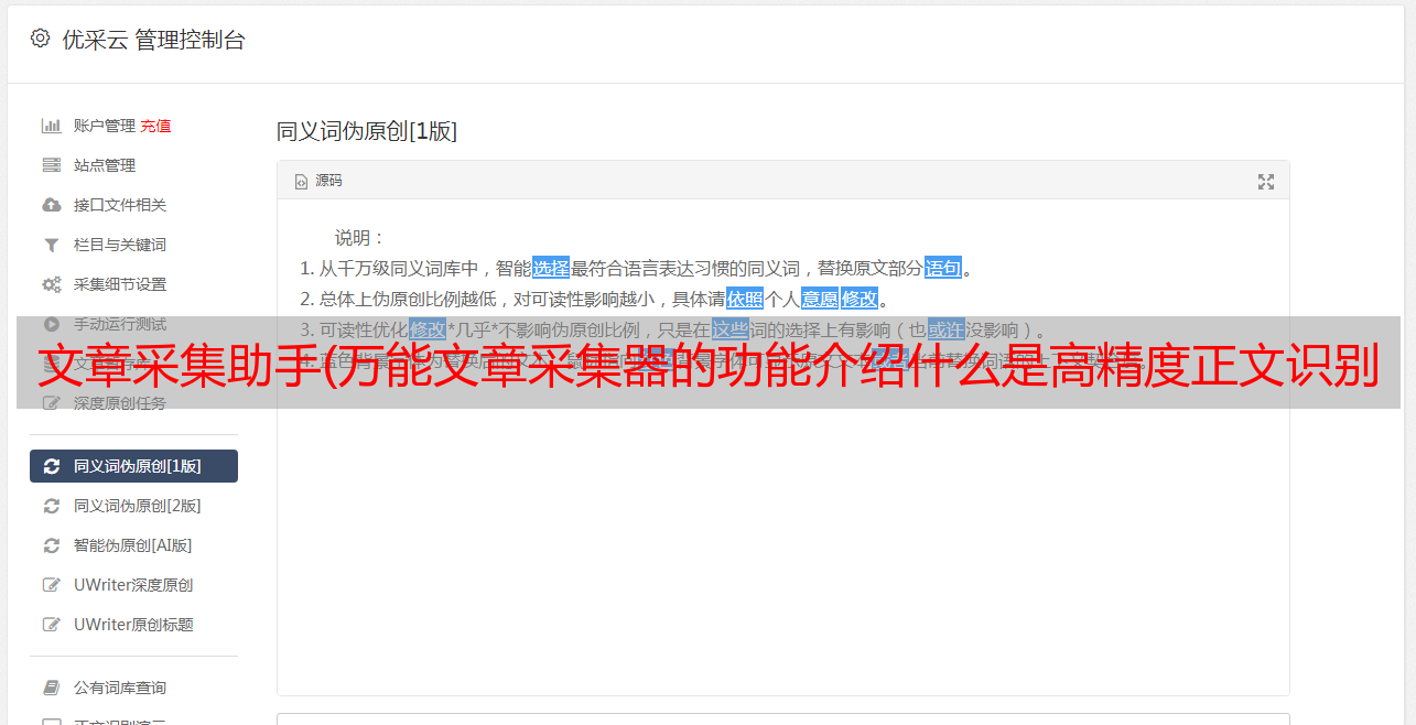 优采云 发布时间: 2021-12-20 06:07文章采集助手(万能文章采集器的功能介绍什么是高精度正文识别识别算法)