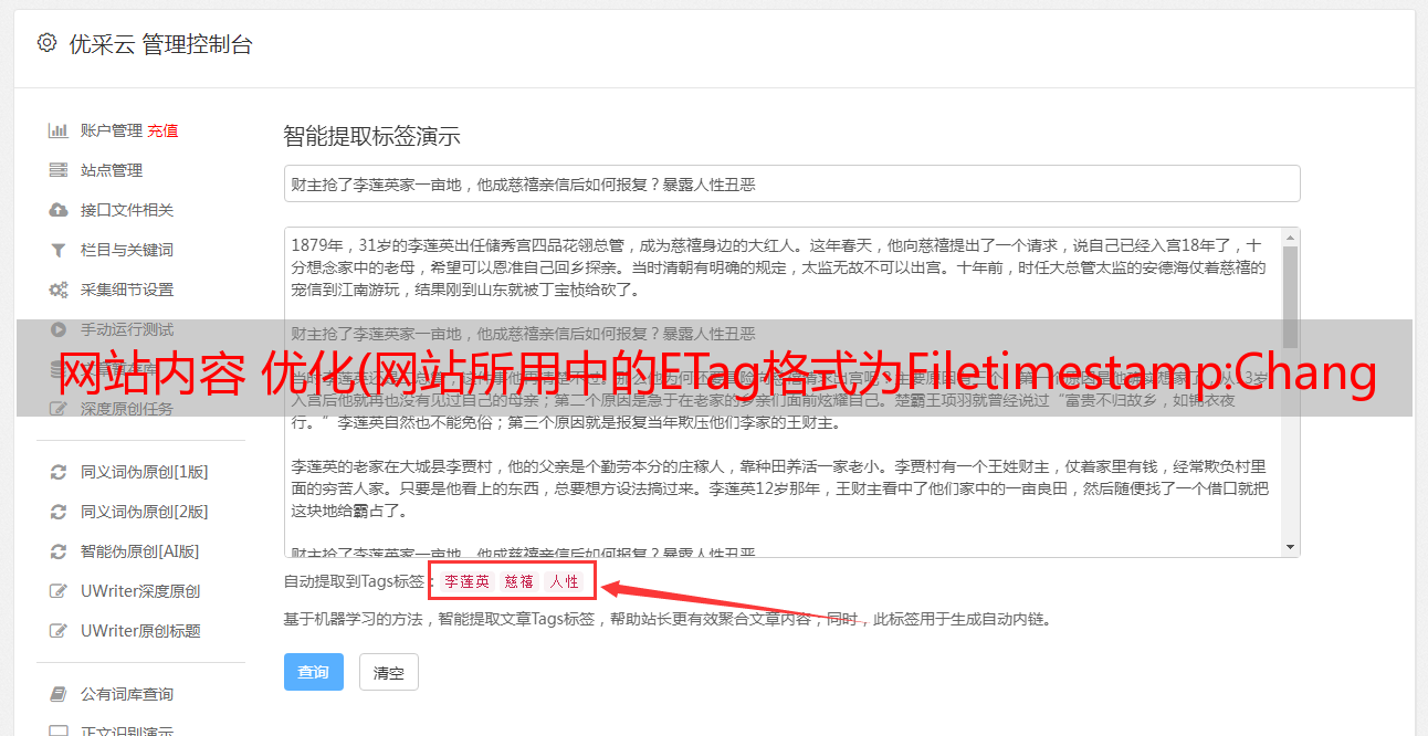 优采云 发布时间: 2021-12-21 17:08网站内容 优化(网站所用中的ETag格式为Filetimestamp:ChangeNumber的机制相似)