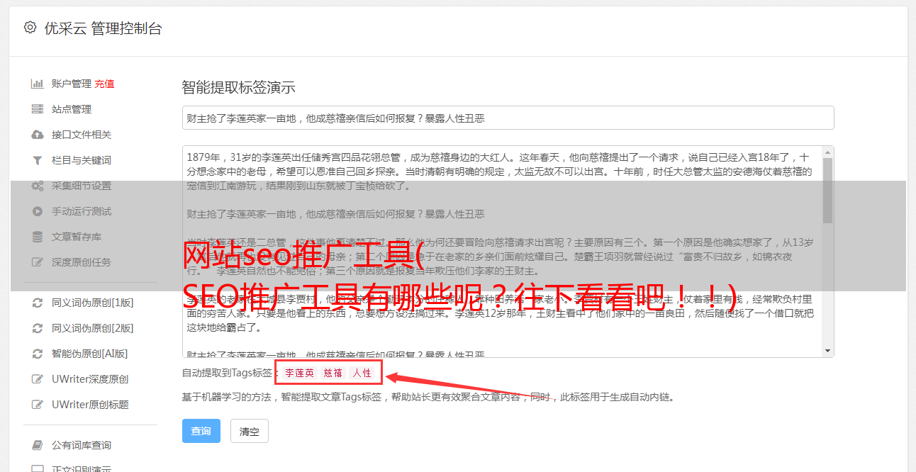 SEO推广主要是通过关键词的优化、网站文章内容的定期更新、站内外的有效建设等,各种优化可以提升网站的排名@> 并吸引用户。点击查看。但是,SEO推广优化需要借助多种工具,才能使SEO推广更有效、更快捷。