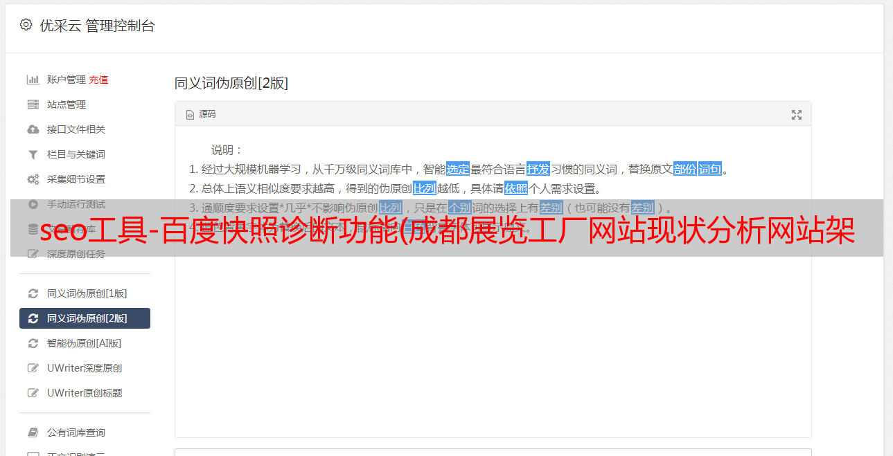 优采云 发布时间: 2021-12-22 06:12seo工具-百度快照诊断功能(成都展览工厂网站现状分析网站架构层级混乱怎么办?)