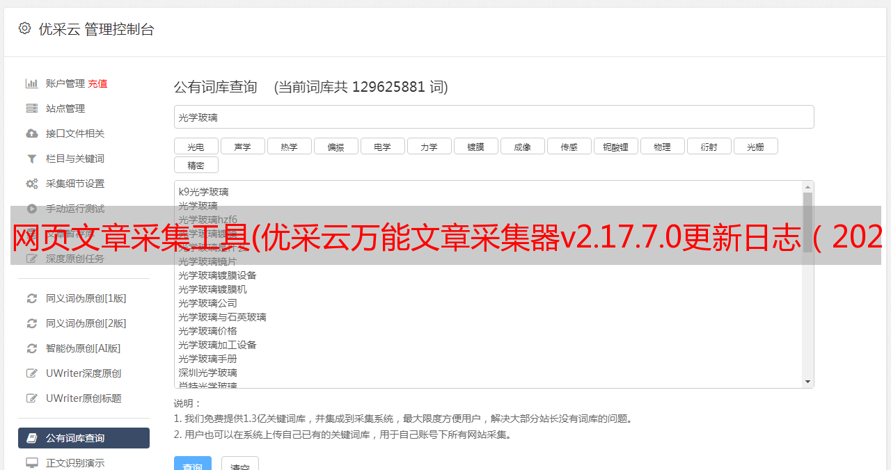 优采云Universal文章采集器是一款简单易用的工具文章采集,用户只需输入关键词即可快速< @采集各大搜索引擎的新闻来源和泛页不再需要翻页找文字。优采云Universal文章采集器不仅具有采集速度快、操作简单的特点,文章采集器还能准确提取身体部位保存为文章,支持标签、链接、邮件等格式处理,将纯文本的结果展示给用户,免去二次处理文本的麻烦。