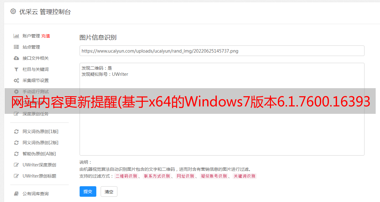 优采云 发布时间: 2021-12-24 19:12网站内容更新提醒(基于x64的Windows7版本6.1.7600.16393出版日期:2011/2/14)