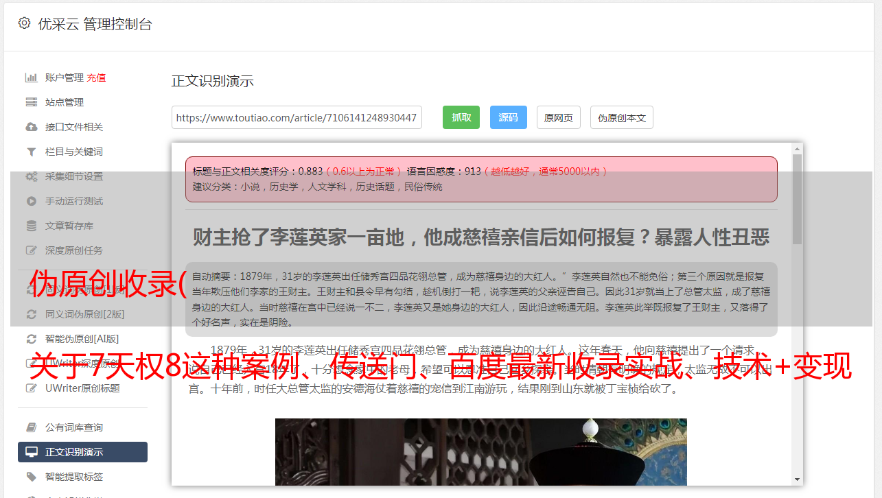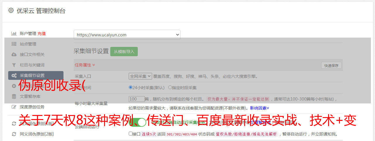 先说网站文章不用伪原创这块,那关于伪原创,在网上,各大seo群里,也有比较多的讨论。话题,毕竟网站还要靠文章吃饭,有没有文章可谈收录?毕竟,收录 越多,只要词库发布高,权重就越大。但是,如果我个人做一些文章,如果你手动复制粘贴,非常非常累人,而且速度也没有太大提升,所以很多大佬想到了采集软件,通过市面上的一些采集器比如优采云等等,有的大佬做了很多伪原创,有的有排名,有的没有,那你就分析一下是否需要做还是不做?