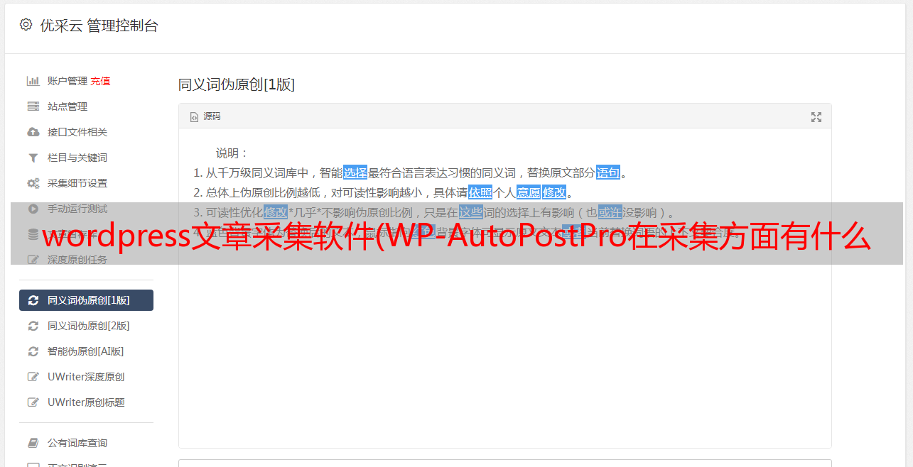 相信很多站长为了迎合搜索引擎的喜好,都有伪原创的需求。WP-AutoPost Pro巧妙地内置了各种伪原创工具,支持百度翻译(需要配置界面),还支持国外最好的伪原创工具WordAi、Spin Rewriter等。