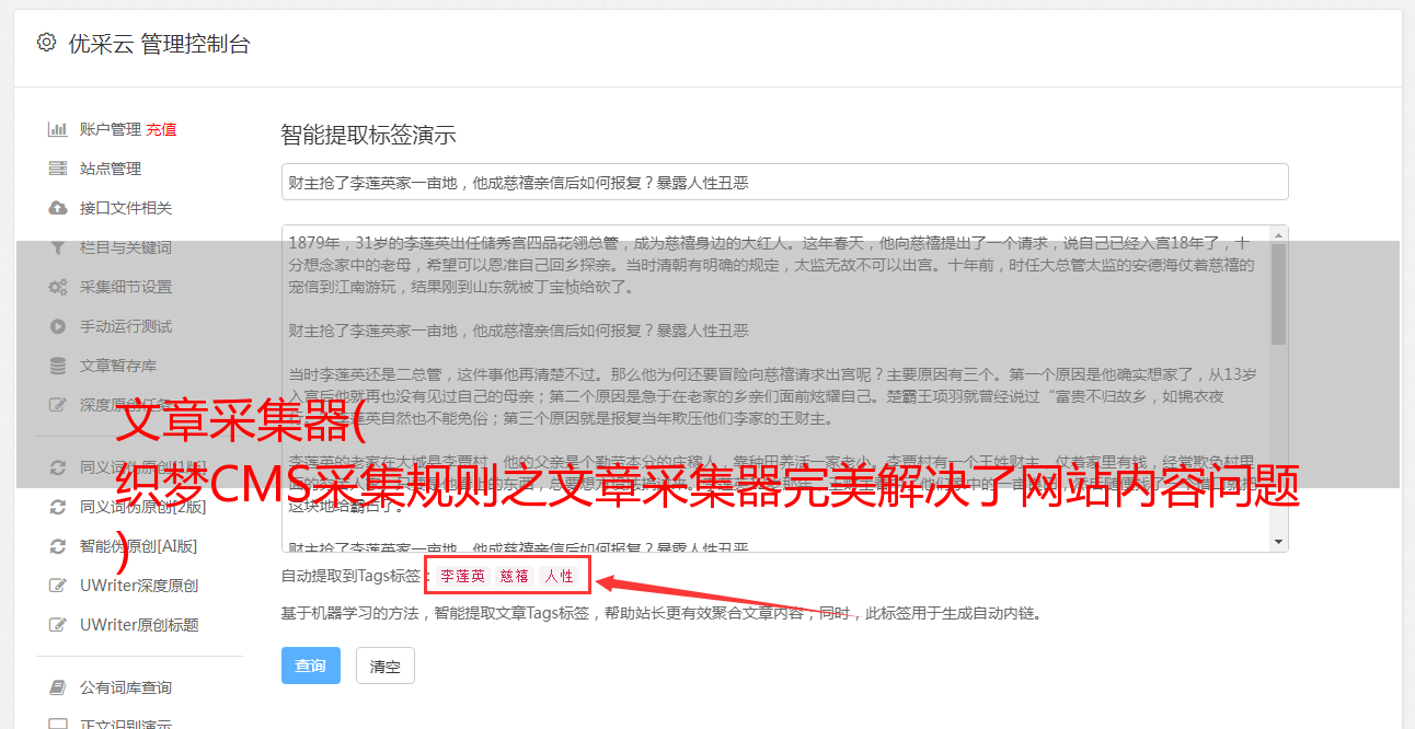 自动采集,无需人工干预:当用户访问网站时,触发程序运行,根据设定的关键字通过搜索引擎(可定制)采集URL,然后自动抓取网页内容。程序通过精确计算分析网页,丢弃非文章内容页面的URL,提取优秀文章内容,最后进行伪原创、导入、生成。所有这些操作程序都是自动完成的,无需人工干预。当采集大量内容时,也可以在VPS服务器上采集,加快采集速度。