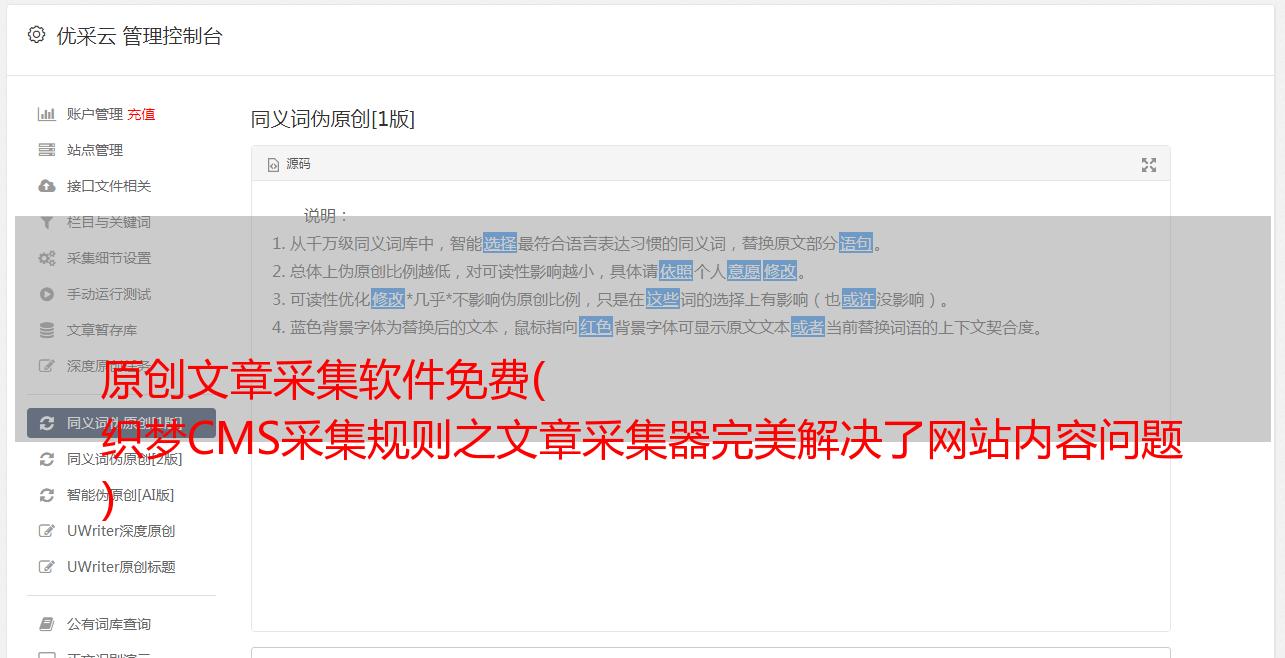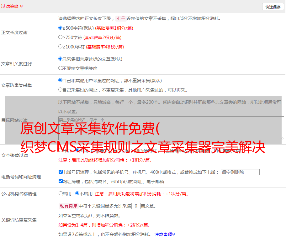织梦cms采集文章采集器的规则,好处是即使不在线也可以保持网站的新内容每天发布,因为配置了自动发布,只要设置好,就可以定时定量更新。多种伪原创@>和优化方法,提升伪原创0@>的命中率和排名。自动标题、段落重排、高级混淆、自动内链、内容过滤、URL过滤、同义词替换、seo词插入、关键词 @>添加链接等方法处理伪原创1返回的文章 @>,提升采集文章原创性能,有利于搜索引擎优化,提升搜索引擎伪原创0@>、网站权重和关键词 @> 排名。
