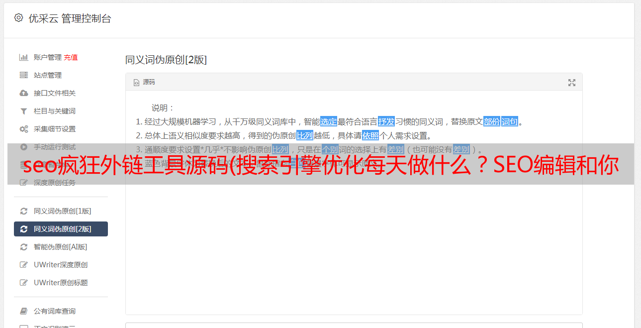 优采云 发布时间: 2022-01-01 06:05seo疯狂外链工具源码(搜索引擎优化每天做什么?SEO编辑和你分享SEO应该做的每一天)