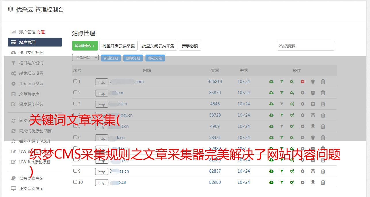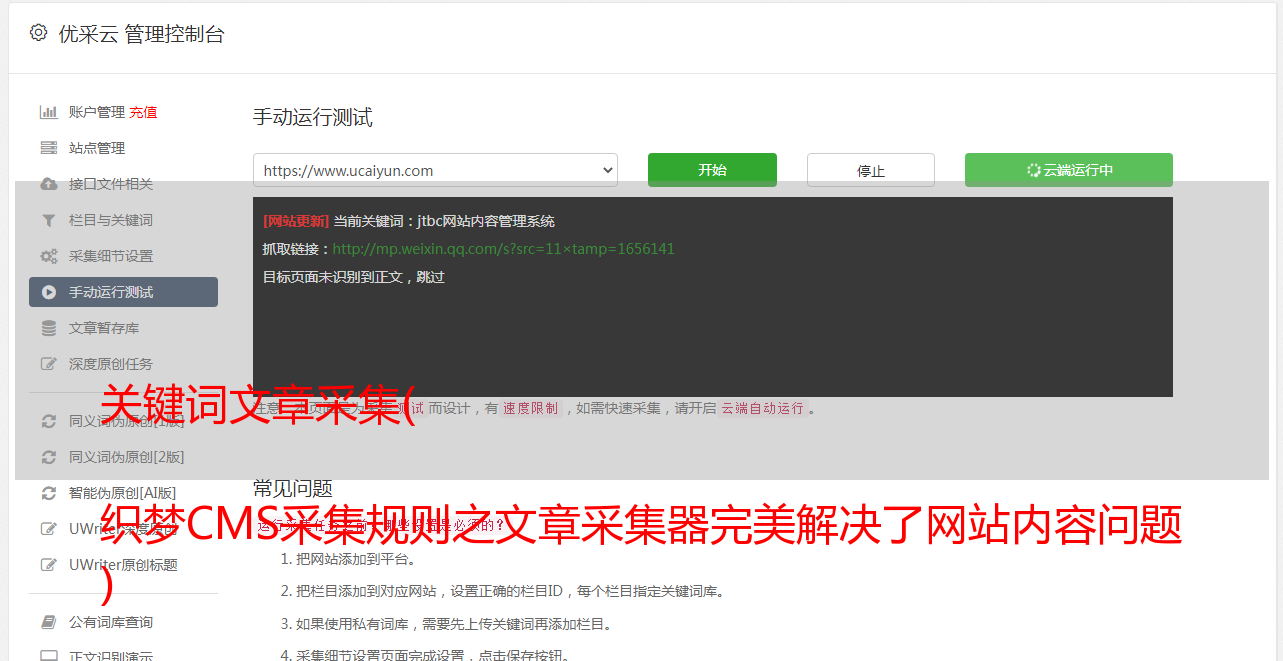 织梦cms采集文章采集器的规则,好处是即使不在线也可以保持网站的新内容每天发布,因为配置了自动发布,只要设置好,就可以定时定量更新。多种伪原创@>和优化方法,提升伪原创0@>的命中率和排名。自动标题、段落重排、高级混淆、自动内链、内容过滤、URL过滤、同义词替换、seo词插入、关键词 @>添加链接等方法处理伪原创1返回的文章 @>,提升采集文章原创性能,有利于搜索引擎优化,提升搜索引擎伪原创0@>、网站权重和关键词 @> 排名。
