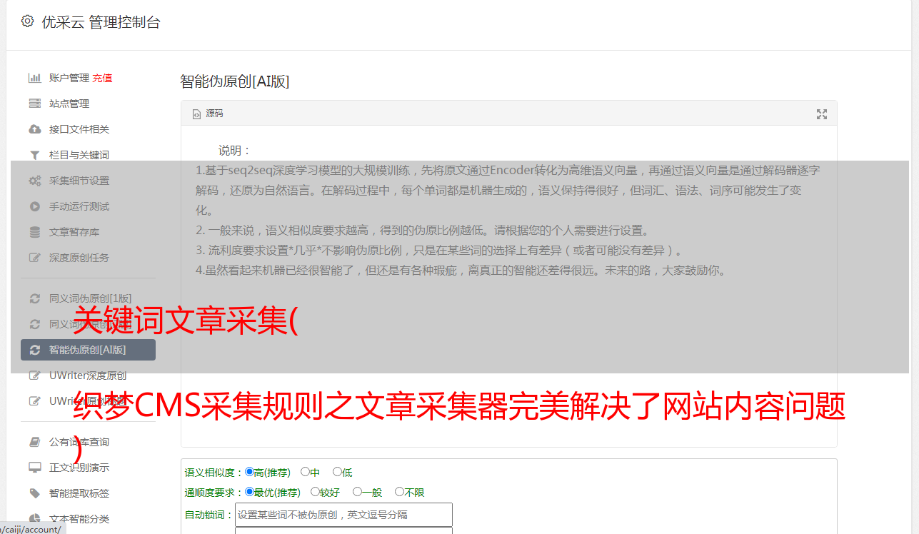 多种伪原创@>和优化方法提高伪原创0@>率和关键词排名:自动标题、段落重排、高级混淆、自动内链、内容过滤、URL过滤和同义词替换和其他提升采集文章原创性能、提升搜索引擎伪原创0@>、网站权重和关键词排名的方法。