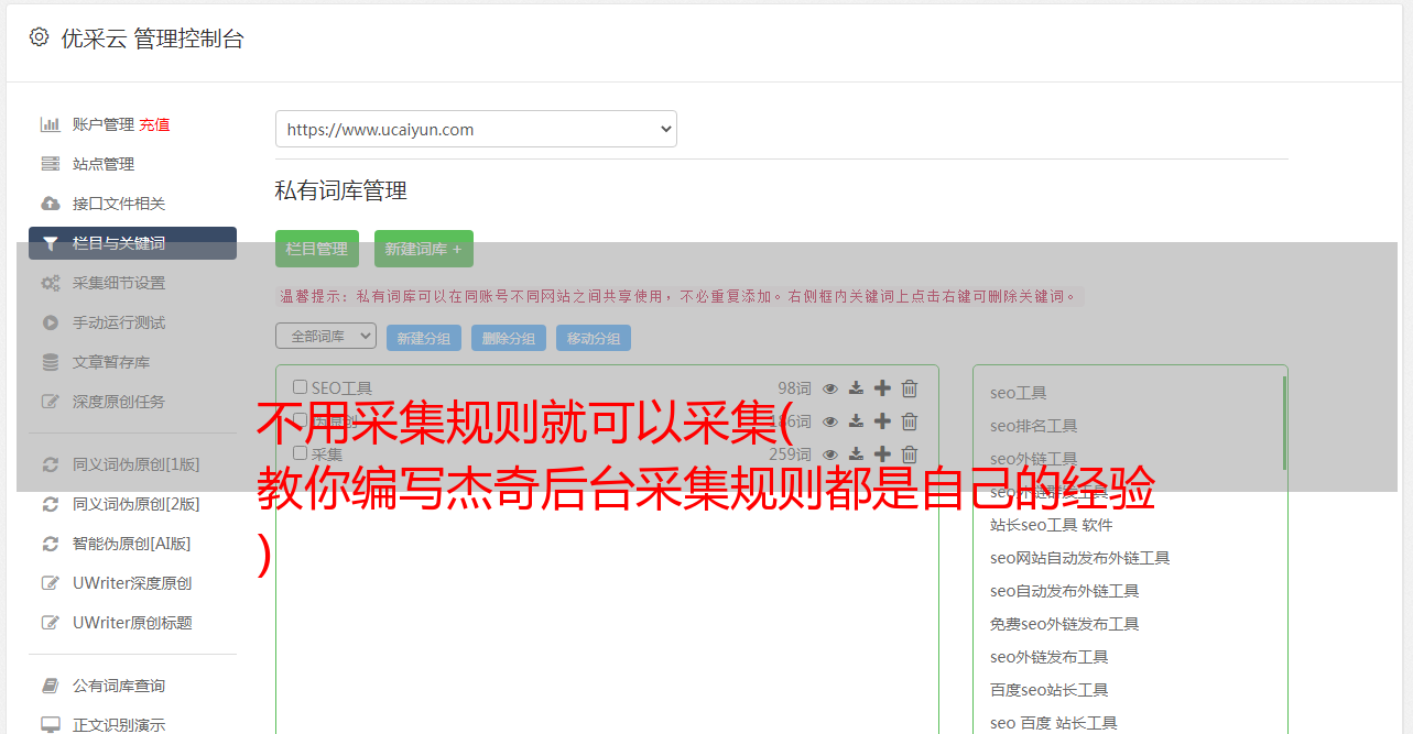 杰奇采集规则原创版大家好,今天正在努力教大家如何写杰奇背景采集规则绝对是我自己的经验,不是从网上复制的,而且我也比网上的会详细,不多说了,先开始写br先添加新的杰奇采集规则然后看杰奇规则描述系统默认变量articleid-文章 序列号chapterid 章节序列号subarticleid 文章子序列号subchapterid Chapter 子序列号系统标签可以替换任何字符串系统标签可以替换任何字符串除了和系统标签可以替换任何字符串除了“”系统标签可以替换数字以外的字符和字符串系统标签可以将数字字符串 采集 规则中需要获取的内容替换为四个以上的系统标签。最后说一下网站的logo。在这里大家可以写这个。 网站 标志为白色。它是 采集 规则的文件名。 网站 名字大家也可以随便写。这里是写如果你要采集的名字,我就写网站想象小说网吧的名字。我将以 wwwxxtxtnet 为例。 网站 地址在这里,填写网站 Main 域名为wwwxxtxtnet文章。子序列号计算方法。这里我们填写 floorarticleid1000。我们填写 floorarticleid1000。就这样。我们还没有弄清楚如何计算它。我们还没有弄清楚如何计算它。我们没有弄清楚如何计算它。于标方采集将此选项设置为“是”,自动检测对方网页代码。这些都是简单的斗争,所以我不会做太多解释。让大家学习一下,我们先打开wwwxxtxtnet,然后随意打开一本小说,然后跳转到文章的信息页。什么是扫盲信息页?信息页为每本书、决算、暑假、读好书、辞职、个人欠费起诉书范文 支部书记述职陈述信息展示页包括文章作者、作者姓名文章、文章的更新状态等。本书的基本总结。让我们在这里继续。我只会打开主页。一本书《挑选一个保定女孩》看到它的信息页地址是wwwxxtxtnetbook5401html,现在是扫盲时间。怎么看信息页的地址?它位于 IE 顶部,显示页面地址。只知道信息页地址或者如果不行,我们需要让Jackie知道,所以我们需要用Jackie的标签替换里面那些动态的东西。现在我们需要把这个地址改成 wwwxxtx 为什么 tnetbookarticleidhtml 会这样写?因为我们的wwwxxtxtnetBOOK没变,只是后面的数字变了,所以我们把那个数字换成了articleid,为什么要这样改呢?因为杰奇的文章序列号要换成articleid,规则的描述里说的很清楚。如果以后遇到,文章信息页地址为wwwxxtxtnetBOOK2256H文章题目乘法口算100题七年级有理数混合运算100题计算机1类题库二元线性方程组应用题真题或敢问精彩问题采集规则在文章信息页右击查看源代码spanstyle"font-size16pxfont-weightboldline-height150">我找到了名字。这里我们只需要获取“pick牛保定”四个字,所以我们将这四个字替换成杰奇标签。看规则就知道,包牛包顶应该换成这个所以