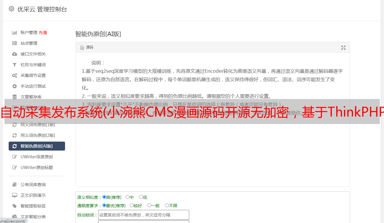 优采云 发布时间: 2022-01-05 04:15自动采集发布系统(小涴熊CMS*敏*感*词*源码开源无加密,基于ThinkPHP5.1及Redis缓存)