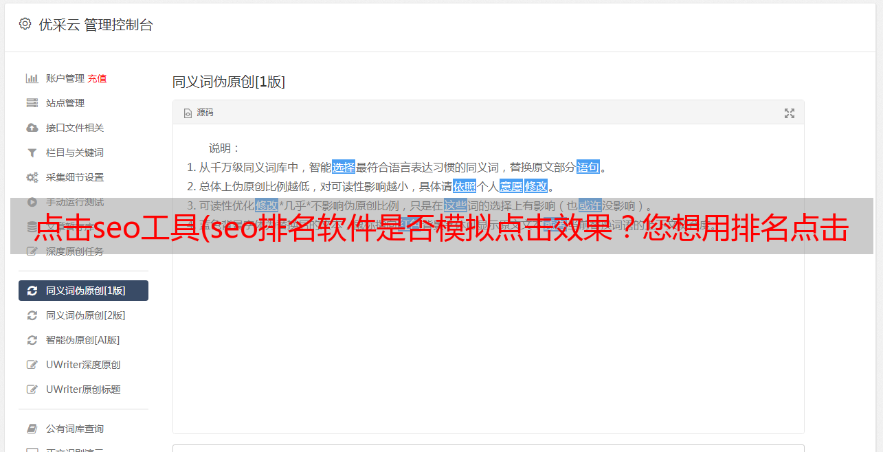 优采云 发布时间: 2022-01-05 07:15点击seo工具(seo排名软件是否模拟点击效果?您想用排名点击软件刷我们网站关键词排名吗?)