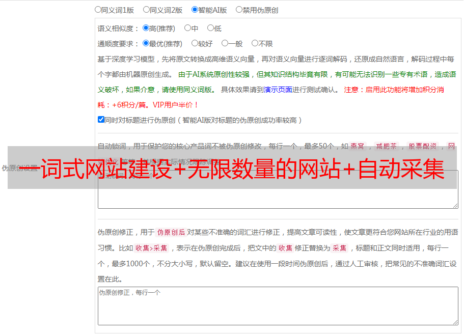在原始文本可读性的前提下自动执行伪原创. 该系统具有唯一的同义词和反义词引擎,该引擎可以适当地更改文章的语义,并使用唯一的算法对其进行控制,以使每篇文章都接近原始文章. 所有这些操作均由系统自动智能完成,无需人工干预.
