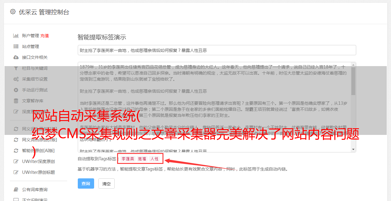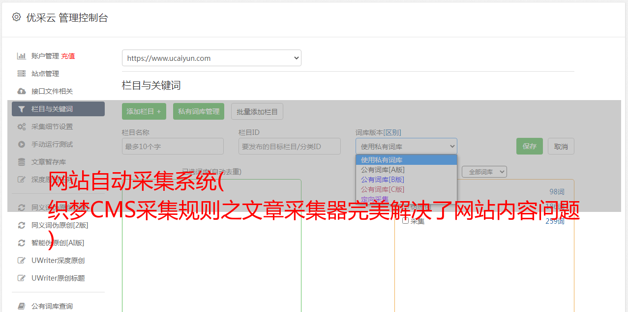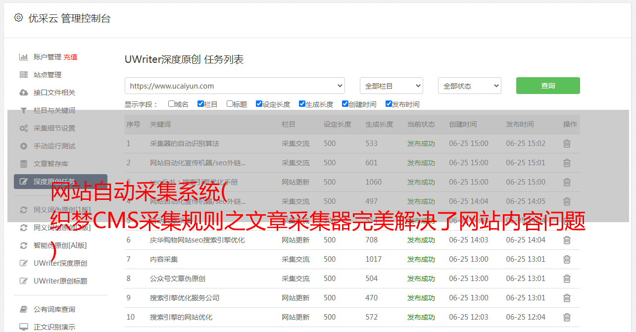 织梦cms采集文章采集器的规则,好处是即使不在线也可以保持网站的新内容每天发布,因为配置了自动发布,只要设置好,就可以定时定量更新。多种伪原创@>和优化方法,提升伪原创0@>的命中率和排名。自动标题、段落重排、高级混淆、自动内链、内容过滤、URL过滤、同义词替换、seo词插入、关键词 @>添加链接等方法处理伪原创1返回的文章 @>,提升采集文章原创性能,有利于搜索引擎优化,提升搜索引擎伪原创0@>、网站权重和关键词 @> 排名。