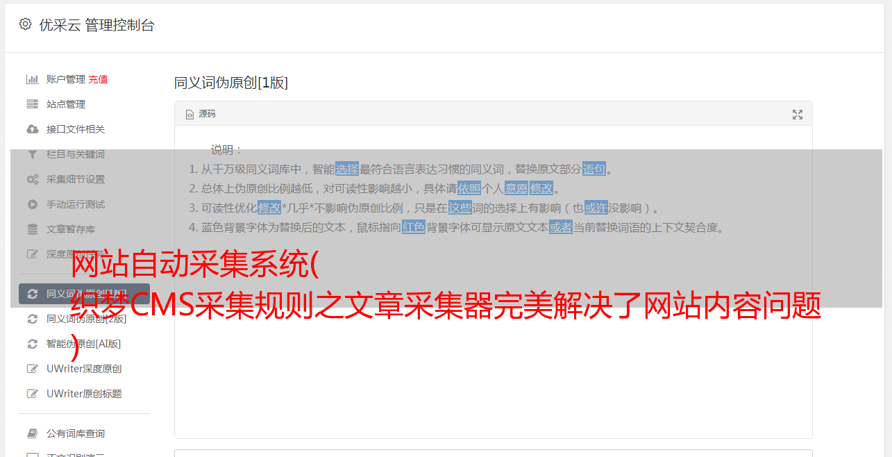 多种伪原创@>和优化方法提高伪原创0@>率和关键词排名:自动标题、段落重排、高级混淆、自动内链、内容过滤、URL过滤和同义词替换和其他提升采集文章原创性能、提升搜索引擎伪原创0@>、网站权重和关键词排名的方法。